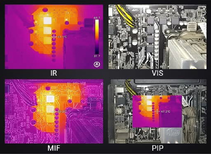 IR, VL, MIF ve PIP modları hedef sıcaklık verilerinin görsel bir görünümünü sağlar ve tam ekranın en yüksek, en düşük ve merkezi sıcaklıklarını otomatik olarak sunar.